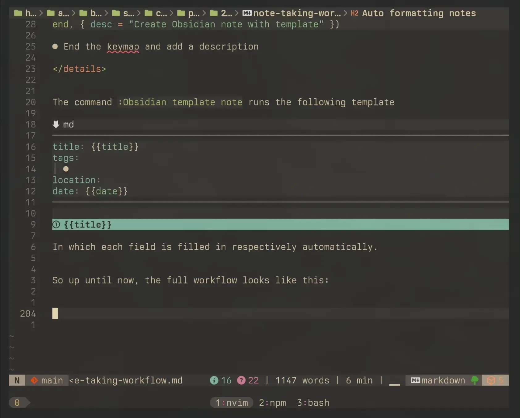 Then changes to ~/notes, runs the :Obsidian template note command (from Obsidian/obsidian.nvim plugin), and after I’m done, returns me back to the original working directory.