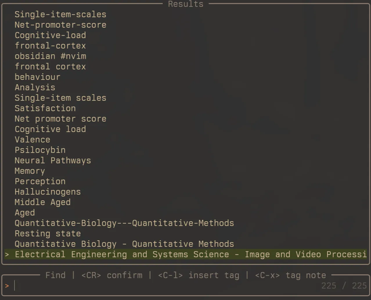 There are other commands that are worthy of mentioning here. For example, if I wanted to use any of the other templates I can use :obsidian template inside neovim and pick the template that I want to use in telescope.nvim. Similarly, if I want to add a tag1 to the note I can search for all pre-existing tags and add them to the note by using the function :obsidian tag.