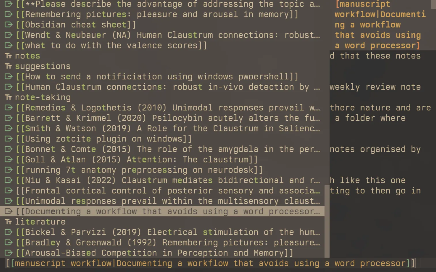 Another important aspect of the workflow, and a common concept in obsidian is linking across notes. The plugin obsidian nvim has a builtin LSP that is triggered when the current working directory is inside the vault and can be triggered by typing [[. This then pulls up a menu with all notes in which you can search for the note you want to link to.