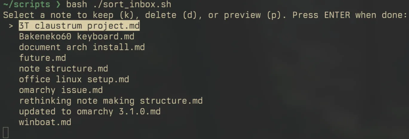 if [[ $confirm == "ok" ]]; then for ((i=0; i<${#actions[@]}; i++)); do note_file="${notes[i]}" if [[ ${actions[i]} -eq 1 ]]; then tag=$(extract_tag "$note_file") if [ -n "$tag" ]; then folder=$(find_folder "$tag") if [ -n "$folder" ]; then mv "$note_file" "$folder" echo "Moved '${note_names[i]}' to '$folder'" else echo "location: '$tag' not found. Skipping '${note_names[i]}'." fi else echo "No location found in '${note_names[i]}'. Skipping." fi elif [[ ${actions[i]} -eq 2 ]]; then rm -f "${note_file}" echo "Deleted '${note_names[i]}'" fi doneelse echo "No changes made."fiThis script looks complex, but it really isn’t. The reason it looks complex is that I have a menu that shows what notes are in the inbox by the note title. The menu is able to highlight each entry in the menu and change the colour of an entry depending on if I wanted to keep the note or delete the note. I also have a preview option here which is just opening the note using bat which is just a fancy version of cat. In then select which notes I want to keep, delete or preview. It looks like this: